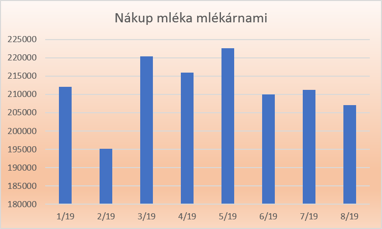V srpnu mlékárny nakoupily (z ČR) 207 084 tis. litrů mléka o tučnosti 3,79 % s průměrným obsahem bílkovin 3,40 % za průměrnou cenu 8,61 Kč/l. Srpnový nákup mléka byl ve srovnání s průměrným měsíčním nákupem ve druhém čtvrtletí roku 2019 podprůměrný (průměrný měsíční nákup ve druhém čtvrtletí činil 217 526 tis. litrů). Při porovnání srpnového nákupu mléka s nákupem v červenci došlo ke snížení nákupu o 4 084 tis. litrů. To znamená pokles o 1,9 %. Při meziročním srovnání došlo v srpnu 2019 ke snížení nákupu o 1,4 %, tedy o 2 927 tis. litrů mléka