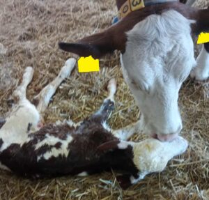 Po porodu zkontrolujte průchodnost dýchacích cest a odstraňte zbytky hlenu nebo plodové vody. Pokud tele samo nezačne dýchat, pomozte podrážděním nozder, poléváním zátylku studenou vodou nebo použitím resuscitátoru. Každá minuta rozhoduje o přežití a vitalitě mláděte. -